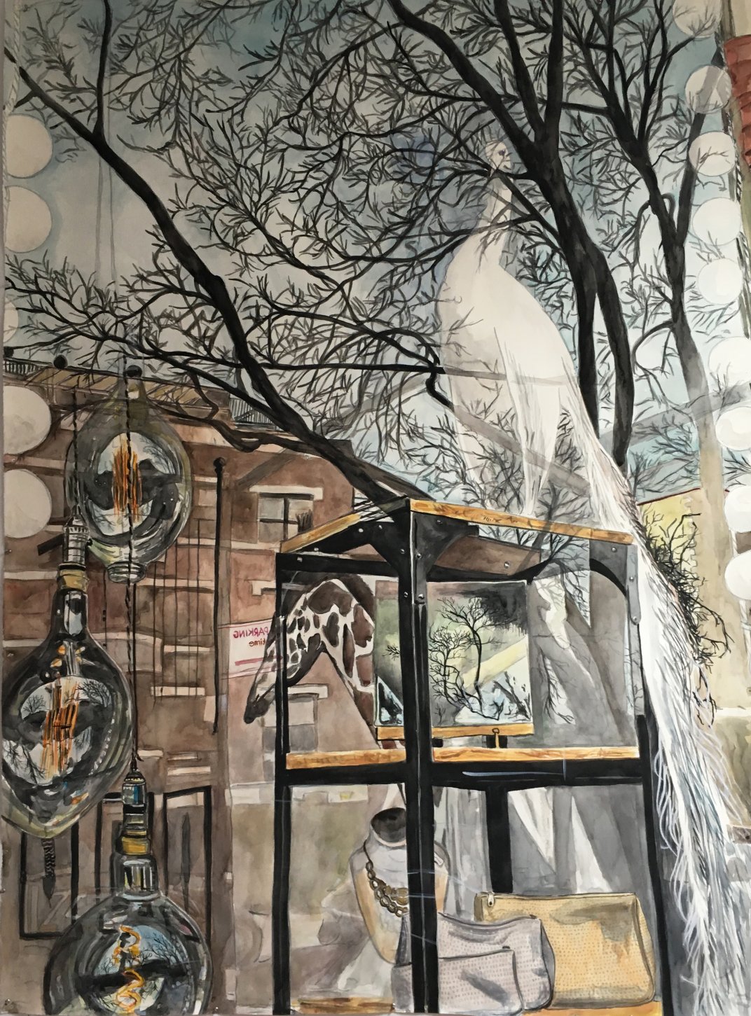 Inside Outside Filaments (Atlantic Avenue, Brooklyn, 2019 is a 75x55" watercolor on fabriano paper. It is from my series Inside Outside Windowphilia which are large scale watercolor paintings which present a graceful confusion of reflections.