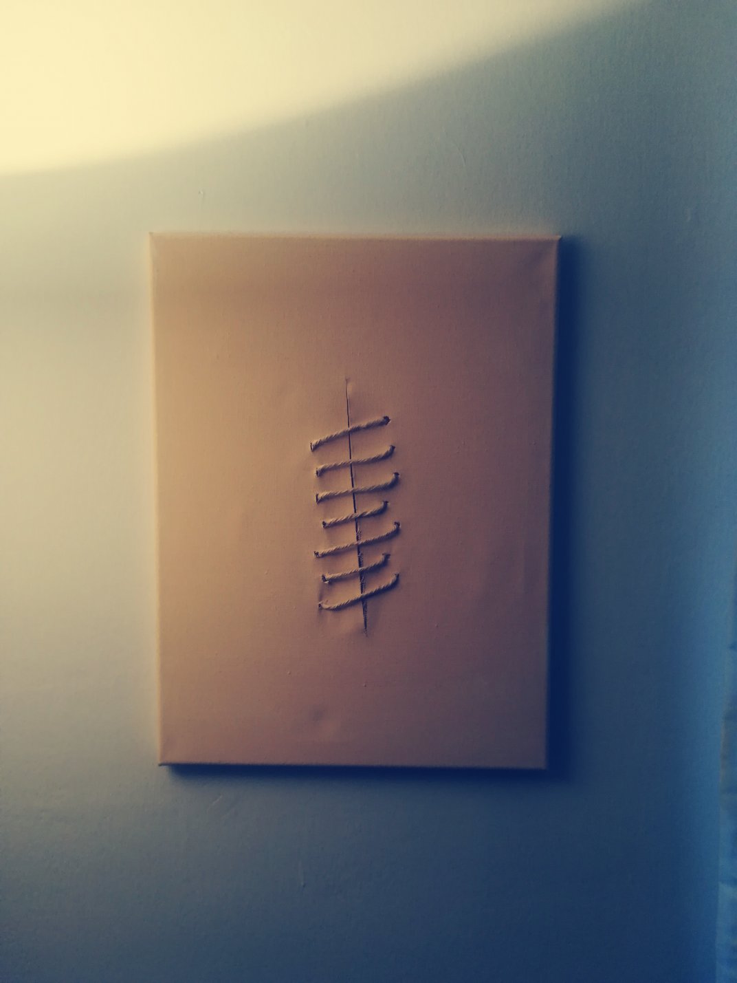 Acrilico su tela e corda 30x40cm fine di un epoca e il titolo, ha mille interpretazioni, ma la prima va in contrapposizione al periodo dei tagli sulla tela di fontana, suturando quest ultimo.