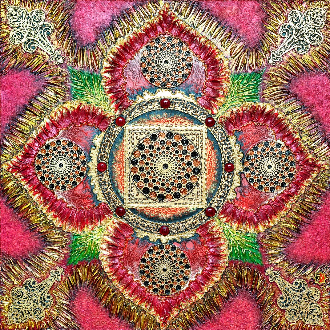 Size 60x60 cm. (2020). Canvas, texture paste, brass leaf, glass fusing and decorative elements. A symbol of passion and life is created to awaken in our soul the energy of courage, fire and confidence. Looking into the fascinating depth of this picture, you can feel as if a bright flamy flower of Strength, Confidence and Protection is blooming in your Soul.