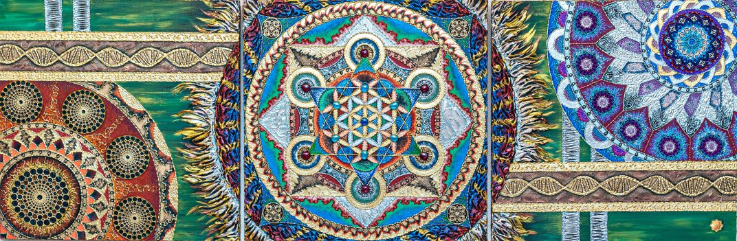 Trying to create an image of strength and peace, wisdom and balance, the artist decided to combine powerful symbols of various cultures and traditions in her paintings. In the center of the picture there is a DNA symbol that unites the entire composition. Its meaning is simple and clear - no matter how different we are, we are all people and that means that on a sacred day and hour we can always find a common language and a common symbol.