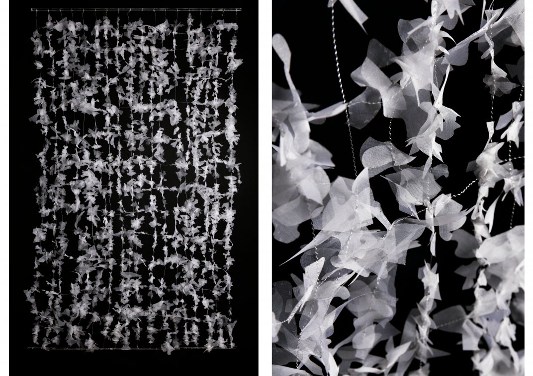 This artwork started with a series of photographs of this phenomenon, which I turned into a digital pattern and laser cut onto a white silk organza fabric.