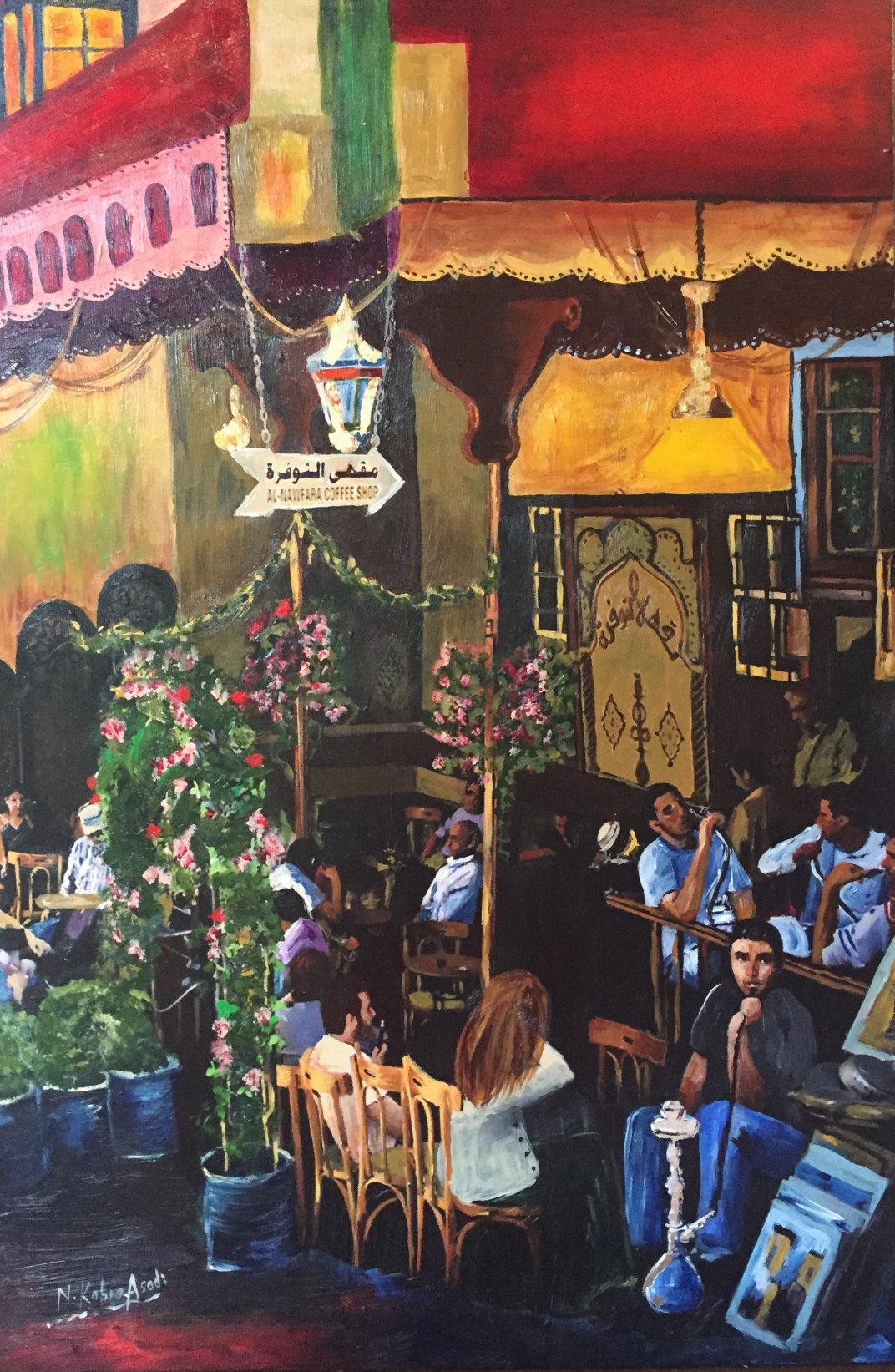 This is a painting of Nofara cafe in Damascus - Syria. its the oldest cafe in Damascus and more than 500 years old. located in the old town and is one of the most popular spots to visit by both locals and tourists. The name Nofara means (fountain) in Arabic and it refers to a fountain that used to be close to the cafe years ago. in this painting I wanted to show the daily life at this place, the energy and vibes of the people there. people drinking tea and smoking hooka. walkers by and art galleries close by. this painting was done in 2018. framed and ready to hang on a wall. size 16x24 inch