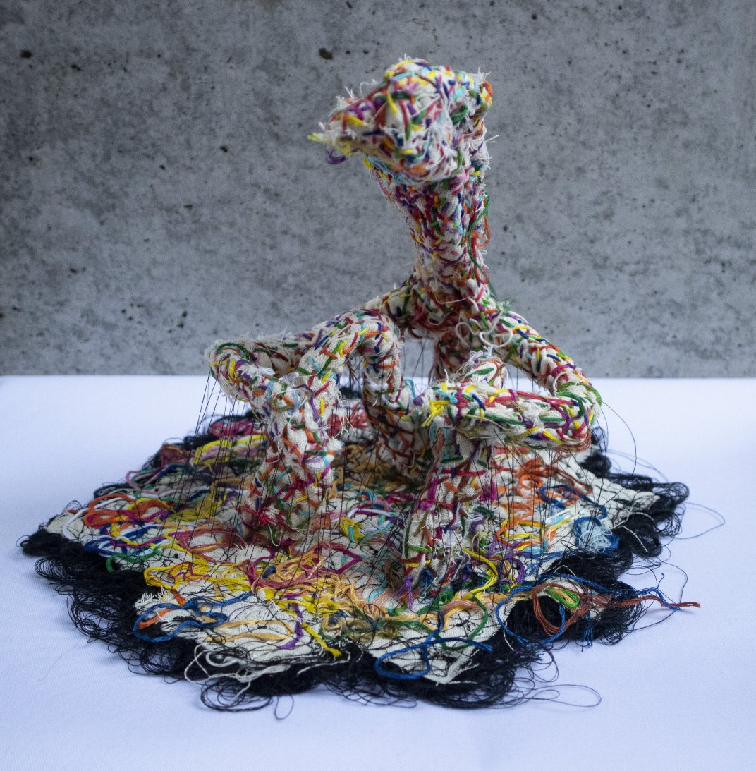 I got this idea from someone saying “to create something from 0 to 1 is much more difficult, respectable and important than to develop something from 1 to 100”. I wonder if there is anything truly created from 0. I think all things in the world are linked in some way even if the link is too weak or complicated to notice or find. When people create something, they will have their own ideas or aim even if they don’t think they have, I guess they have in an unthinking or unconscious manner. When people are born, they are influenced by everything in the world even things you don’t see, hear, notice or know of its existence. Even before they are born, they are probably influenced by them because their parents are influenced, and you are born from them. I think even if just one thing didn’t exist, the world would likely be different. Which means that everything is linked and influences each other. So there are no coincidences in the world and everything happens necessarily. This work expresses the idea that people think they are unique and different but their uniqueness is influenced by all things in the world and not created from 0. Also they don’t realise that they are linked and they think their originality is created on their own from 0. Size: height 200mm, length 200mm, depth 250mm. Material: fabric, wire and thread.