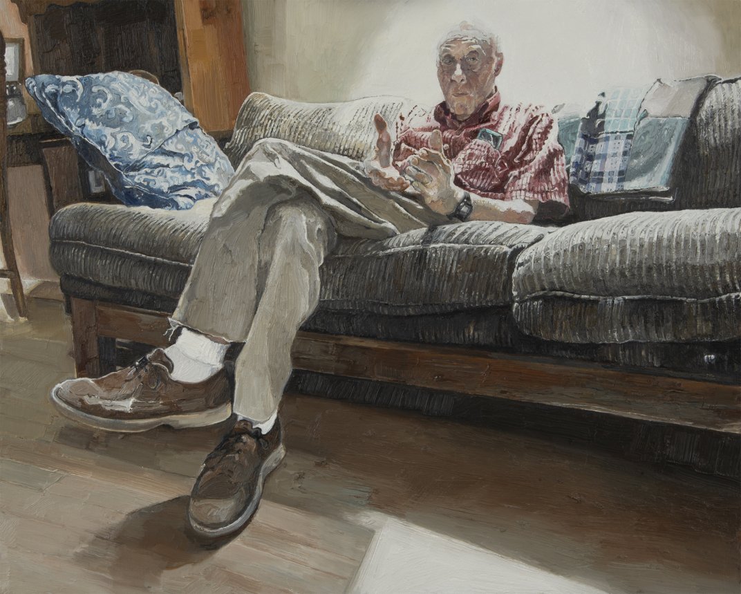 “Just vote—but not against your own interests” This view of my father shows how I saw him when I was a small child and, because of my small size, had to look up at him. My father read the newspaper and watched NBC News every night. He said his biggest sadness was knowing that people in poor rural areas continually vote against their own interests, and that he hoped they “smartened up.” In this painting, he has my smart phone in his shirt pocket. He was very interested in Internet research. The forest was shrinking but the trees kept voting for the axe as its handle was made of wood and they thought it was one of them. –Turkish proverb