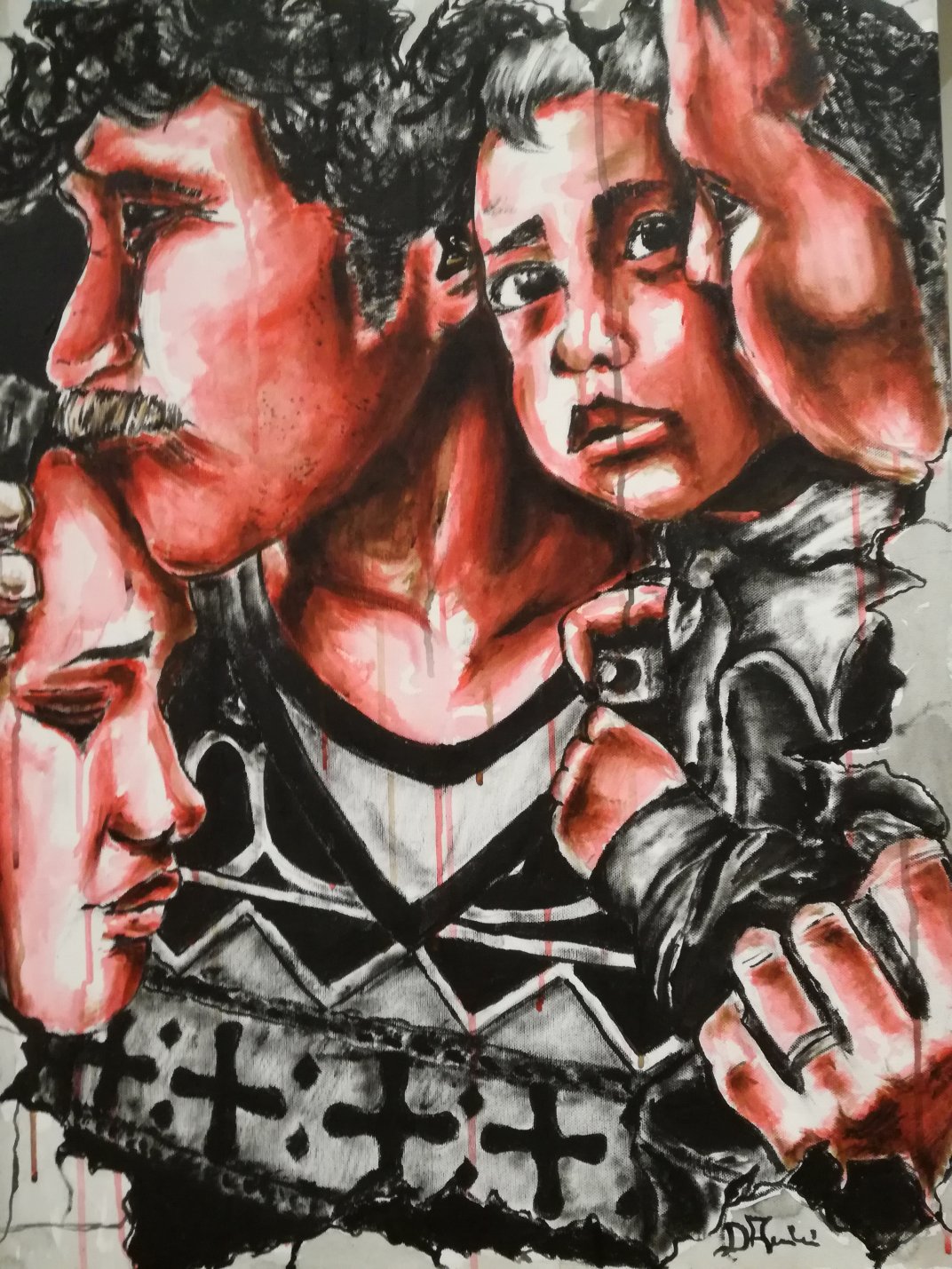 Quest'opera racchiude tutte le caratteristiche del mio stile. E 'una pittura figurativa dove vengono rappresentate donne, uomini, bambini e anziani. Si parla di realtà disagiate, di folclore, dello scorrere del tempo. Tre elementi sono la forza fondante di tutte le mie opere: mani, occhi e muri. I colori scelti sono essenzialmente tre: rosso, bianco, e nero. La tecnica è legata al fumetto, alla fotografia in bianco e nero e alla street art; al fumetto per il nero e per come viene utilizzato, alla fotografia in bianco e nero per la sua ispirazione ad essa per quanto riguarda i soggetti, e alla street art per la rappresentazione dei muri e all’uso di materiali che servono a renderlo più realistico.