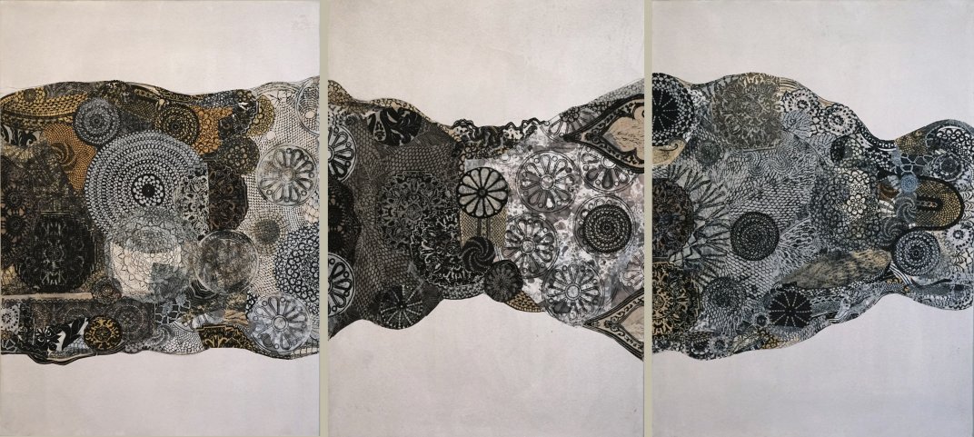 Flux, 2018-2019, trittico, collage su cartone montato su telaio di legno.