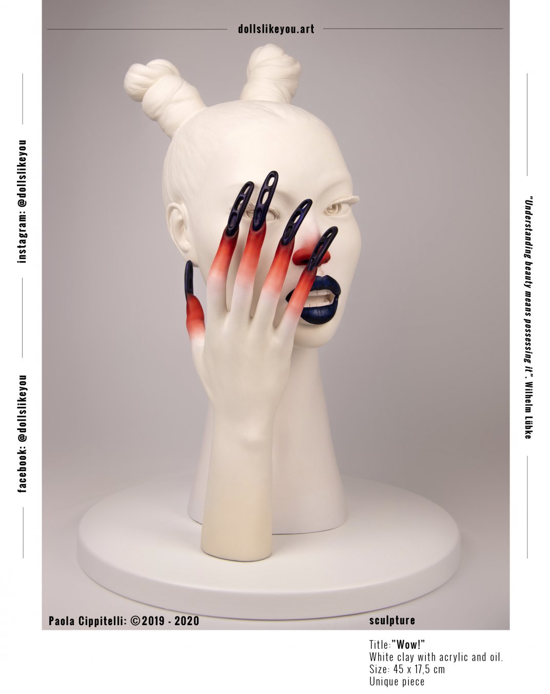 Qui vi presento "Wow!", dal mio progetto "Bellezza 2.0.2.0". Questa è una scultura realizzata in argilla bianca e dipinta con acrilico e olio.