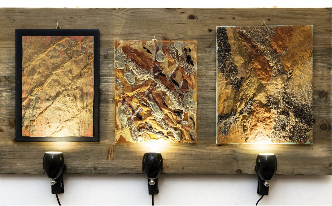 i quali sono illuminati dal basso da 3 faretti, che evidenziano i volumi formati dalla sabbia e quindi mettono in risalto la tridimensionalità dei quadri.