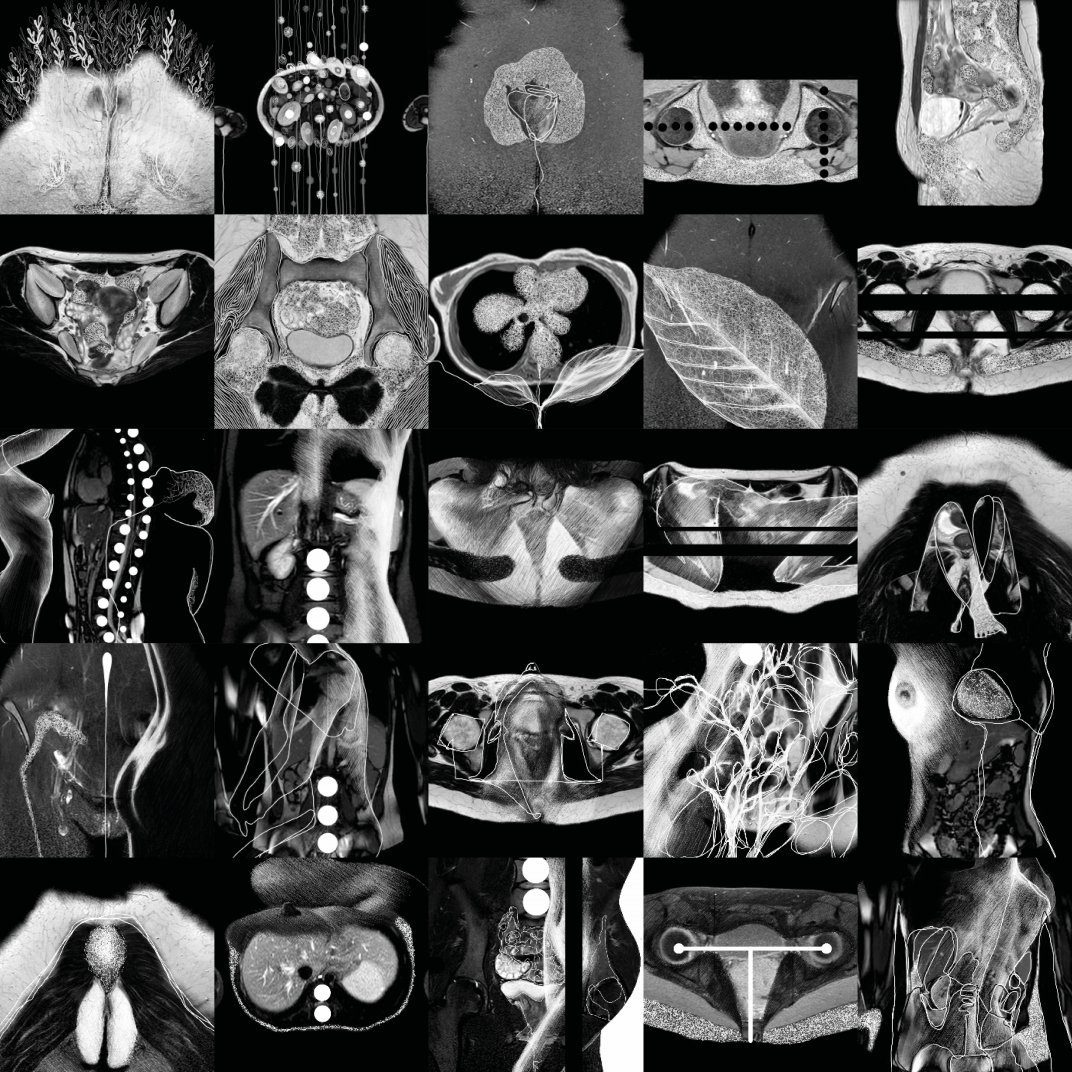 The images were arranged in series and assembled together, to refer conceptually to a tabular order classifying diseases, which reduces the bodies of sick people into alpha-numerical codes, depriving them of identity. The arrangement is not random but numbered and should be read as a progressive and growing introspection. The choice to assemble the sequences in a single image shows on one hand the desire to standardize the depersonalizing photographic fragmentation of each single portion of the body created by MRI and on the other hand to bring the body back to art as a unicum, concentrating the gaze of the viewer on the entire content of the work.