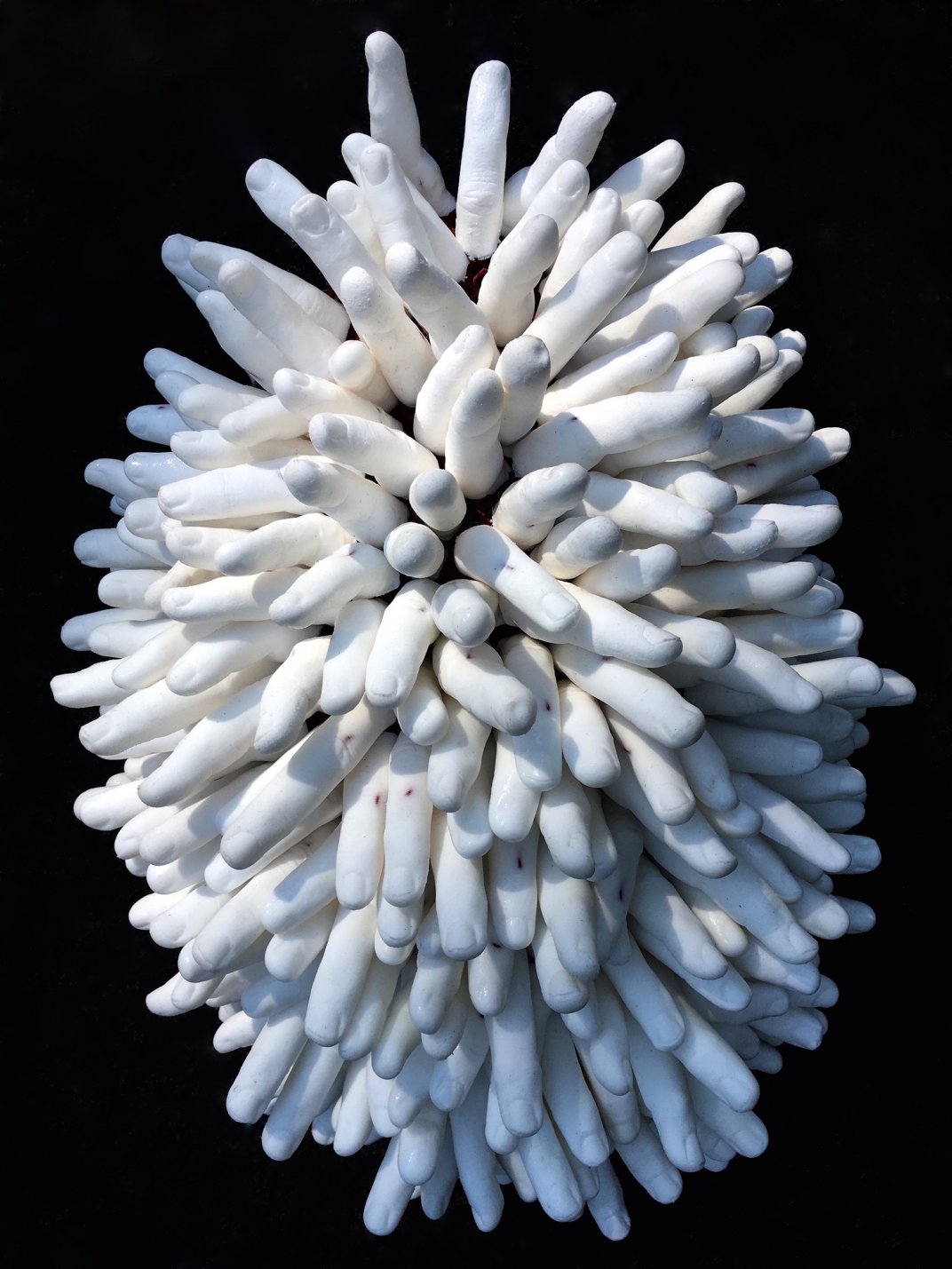 "Anemone" evokes the hand of man in climate change, causing the warming of our oceans and destroying and bleaching coral around the world. From afar, the piece appears to be a bleached anemone, or an abstract decoration, but upon approach one sees that each protrusion is a human finger. The fingers point outward, accusing, blaming, addressing the viewer. Who is culpable? Who will take responsibility?