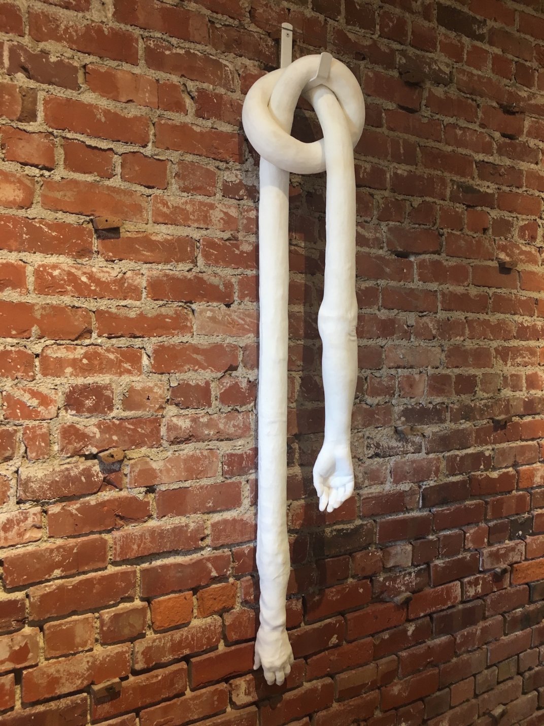 "Knot" is as heavy as it looks. Made of solid silicone rubber, it was borne of the incredible overwhelming frustration and sense of helplessness I have felt in the current political environment: trapped, bound, tied in a knot. Arms and hands convey so much meaning... tied in a knot they exude inertia, confusion, paralysis. Considering the title "Knot" and its homonym "Not" underscores the challenge, the impediment, of an abstract problem. Previous to the recent U.S. election, my work was rarely political. But now I find that I must use my voice. Aside from its conceptual genesis, however, I feel that its enigmatic weightiness can be translated otherwise, allowing it to reinvent itself according to the viewer’s own experiential connection, and as such becomes universal, transcending a single interpretation.