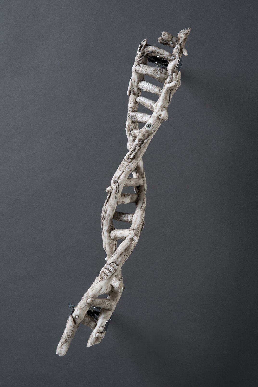 An Allele is one of two or more alternative forms of a particular gene. Again, I am looking at the human being and our investigation of our own genetic code. What are we made of? This piece takes a humorous and quasi-literal look at the traits coded for in our DNA. The stainless steel laboratory clamps imbue a clinical scrutiny of an outsized sequence.