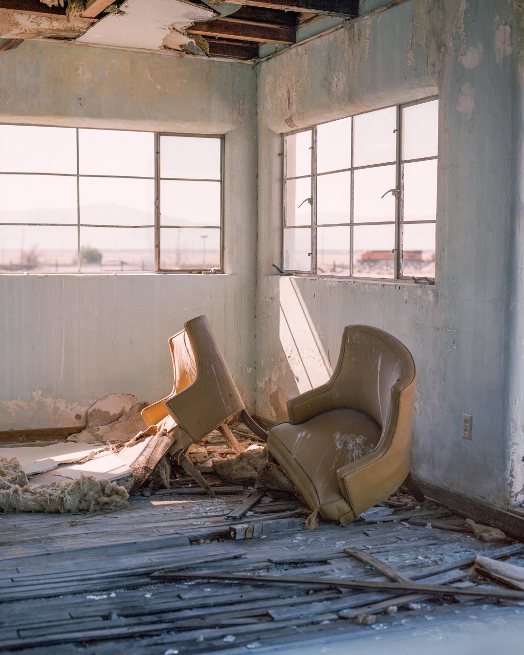 Two broken chairs in an abandones house in the middle of the Mojave Desert. Taken on large format film, the image conveys a sense of mysterious history.