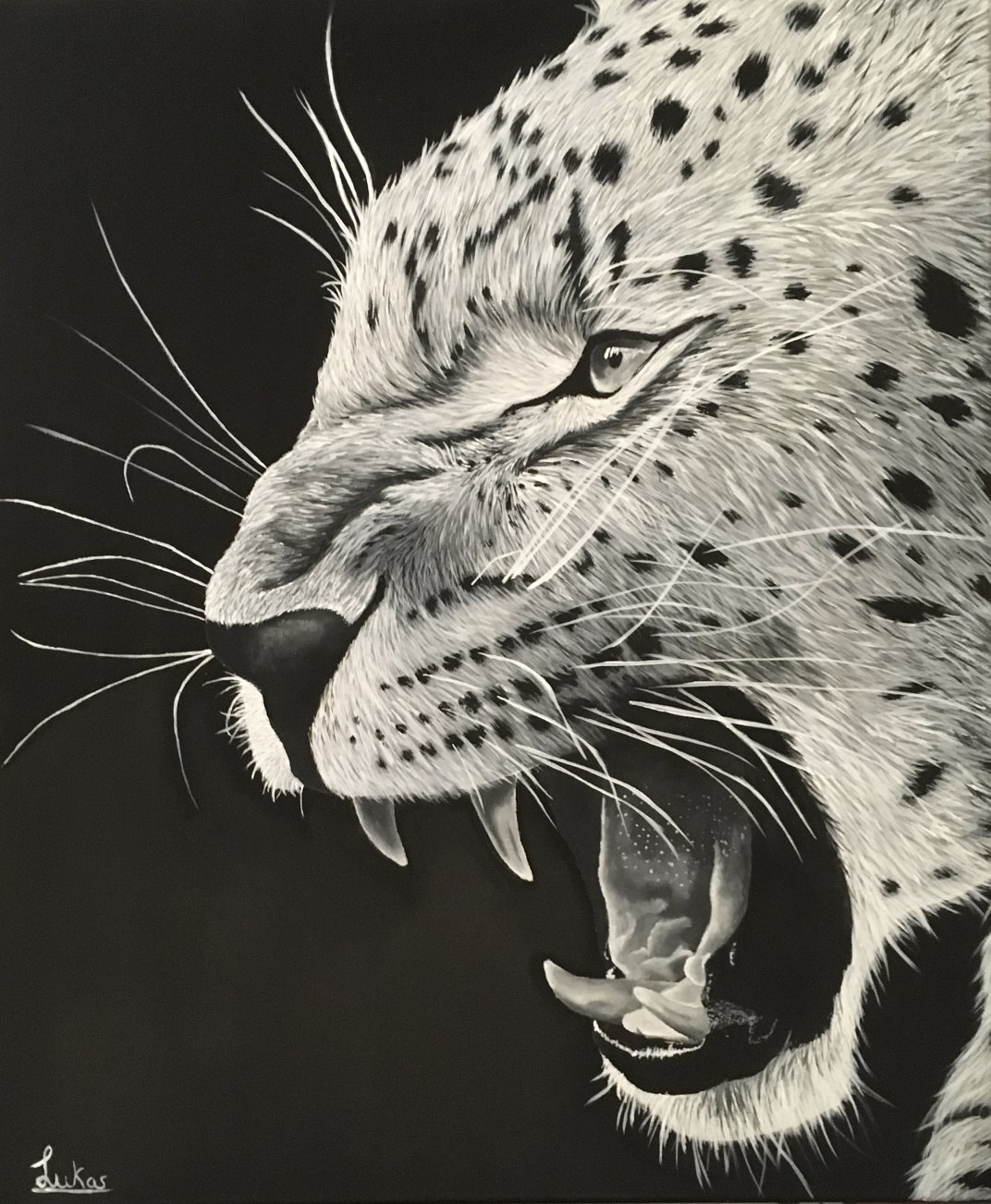 Il ritratto che propongo raffigura il primo-piano in stile realistico del muso di un leopardo. Per realizzarlo ho adoperato pittura acrilica su tela, utilizzando solamente il bianco e il nero.