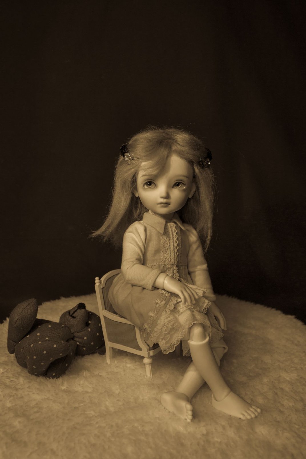 This photograph is part of a series exploring different styles of portraiture from various art movements, from the Renaissance to Art Nouveau, using doll models.
