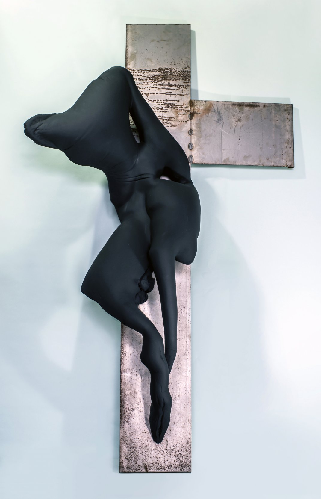La croce dalla quale Cristo non scende è strumento di morte proprio come i gommoni gonfiabili dei migranti, che di certo non sono concepiti per fare rafting. Il colore nero, anch’esso, emblema della morte, riveste il corpo del Cristo quattrocentesco, scomposto e asimmetrico, a forma di tubolare in neoprene, lo stesso materiale dei gommoni che galleggiano nel mare della globalizzazione di cui l’industria nautica cinese è la maggiore produttrice.
