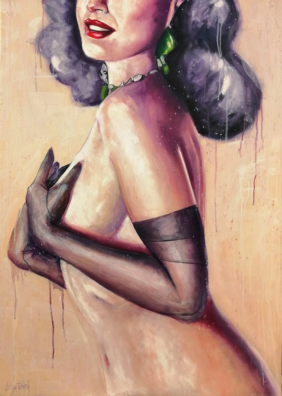 La sua Bellezza è così diretta da risultare feroce, la sua natura è camaleontica e trasformista, la sua bocca maliziosa e la sua pelle argentea e candita è baciata dalla luce della luna! Questa donna disarmante è vestita solo della propria consapevolezza, gioca il gioco della seduzione e dell’erotismo sottile o semplicemente si prendo gioco di chi la guarda: Come le Sirene che incantano con la loro voce soave, come le Driadi che danzano per trasmettere