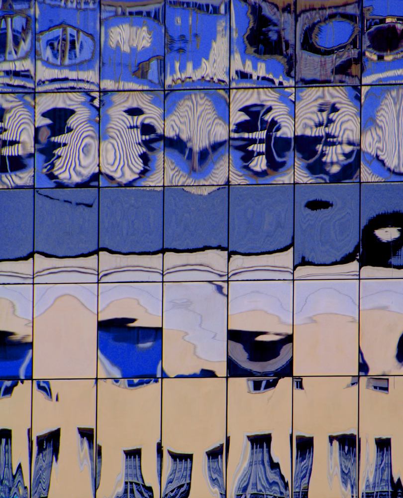 Questa fotografia è stata scattata nel quartiere EUR di Roma, e mostra dettagli di un edificio che si riflette, con deformazioni astrattizzanti/surrealiste, sulle vetrate del palazzo del Ministero dei Trasporti posto di fronte.