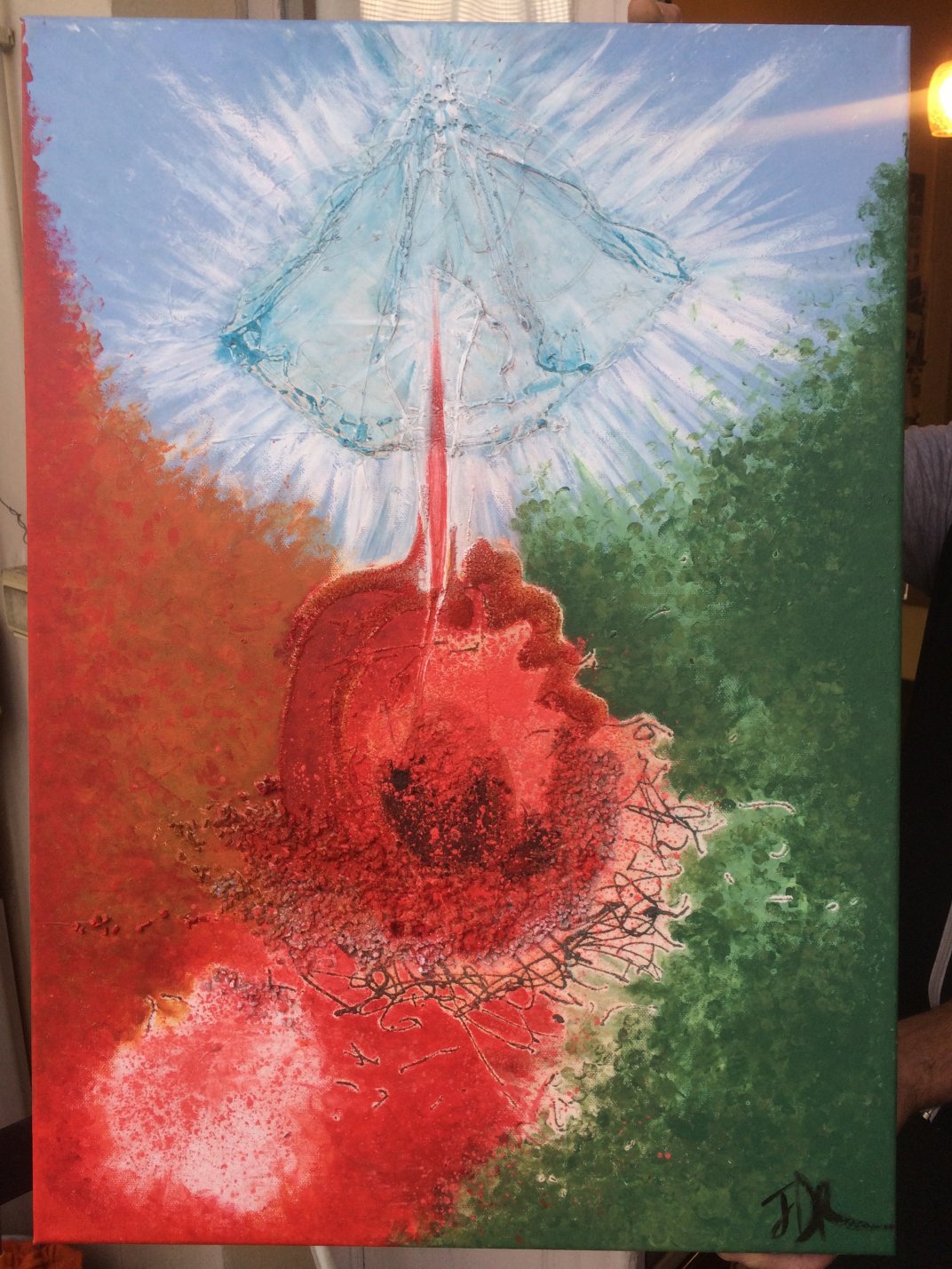 I begin this painting on april 2019, at the begin I was made the world, during the creation I saw an hanging man, so I search the tarot paper and I decided that he his my hanging. My world inside was so sad and full of troubles...I resumed my painting on this march, and I decided to finish it. In one year I discovered a lot of things of myself and I've had overwhelming emotions...this painting represents my inside world, my heart, my emotions and myself. Thank You. Jiv