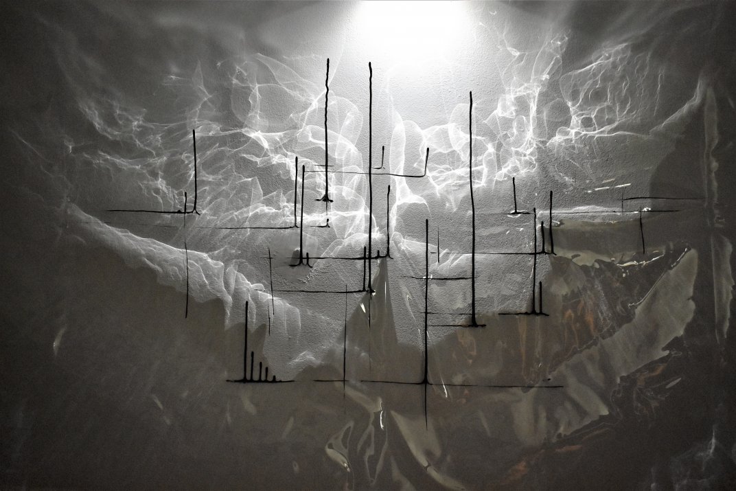 L'opera è un esempio, non potra essere riprodotta fedelmente in quanto è unica, la parte che rimane invariata è il PVC con le colature di acrilico nero, la parte bianca sono riflessi di luce che variano in base a molteplici fattori.