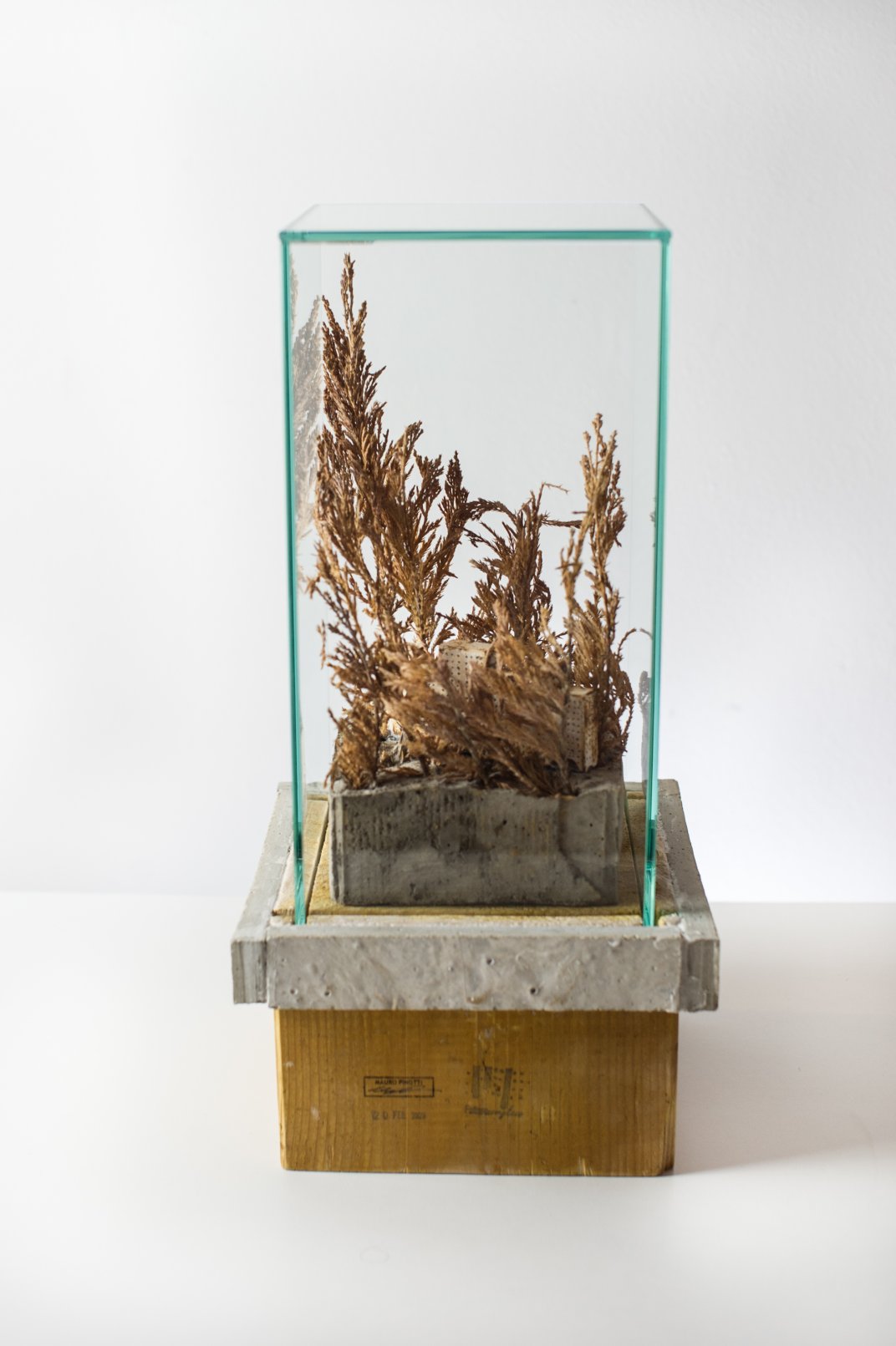 I basamenti, inizialmente formati da solido cemento sono ora tronchi, legni e materiali naturali trovati nel suo girovagare, da questi si ergono piccoli palazzi ed è la proporzione tra i due elementi che porta a considerare quali siano le priorità , ne deriva un semplice e immediato messaggio per l’osservatore l’artista rilega così la civiltà umana a spazi limitati e angusti , faticosi dove l’ambiente naturale è ora predominante .