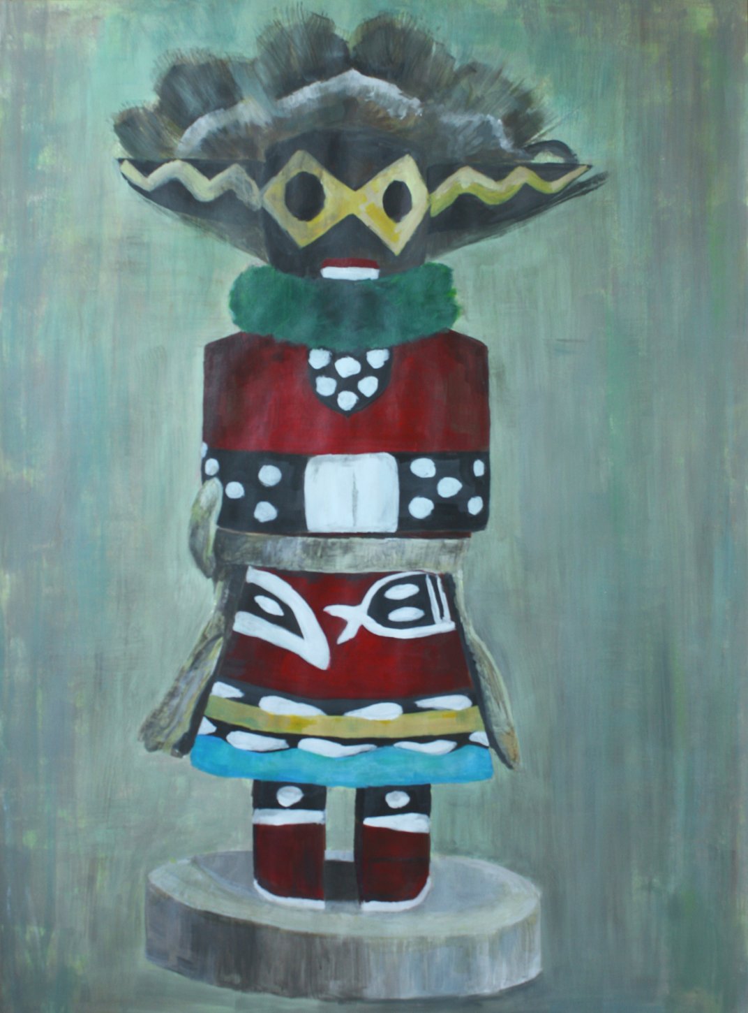 One of three acrylic paintings depicting a traditional Hopi Kachina wood puppet. A wandering in the use of toys as help and initiation in the adult life, before the plastic doll and car, at a time where symbolic game did not hesitate to include the spiritual.