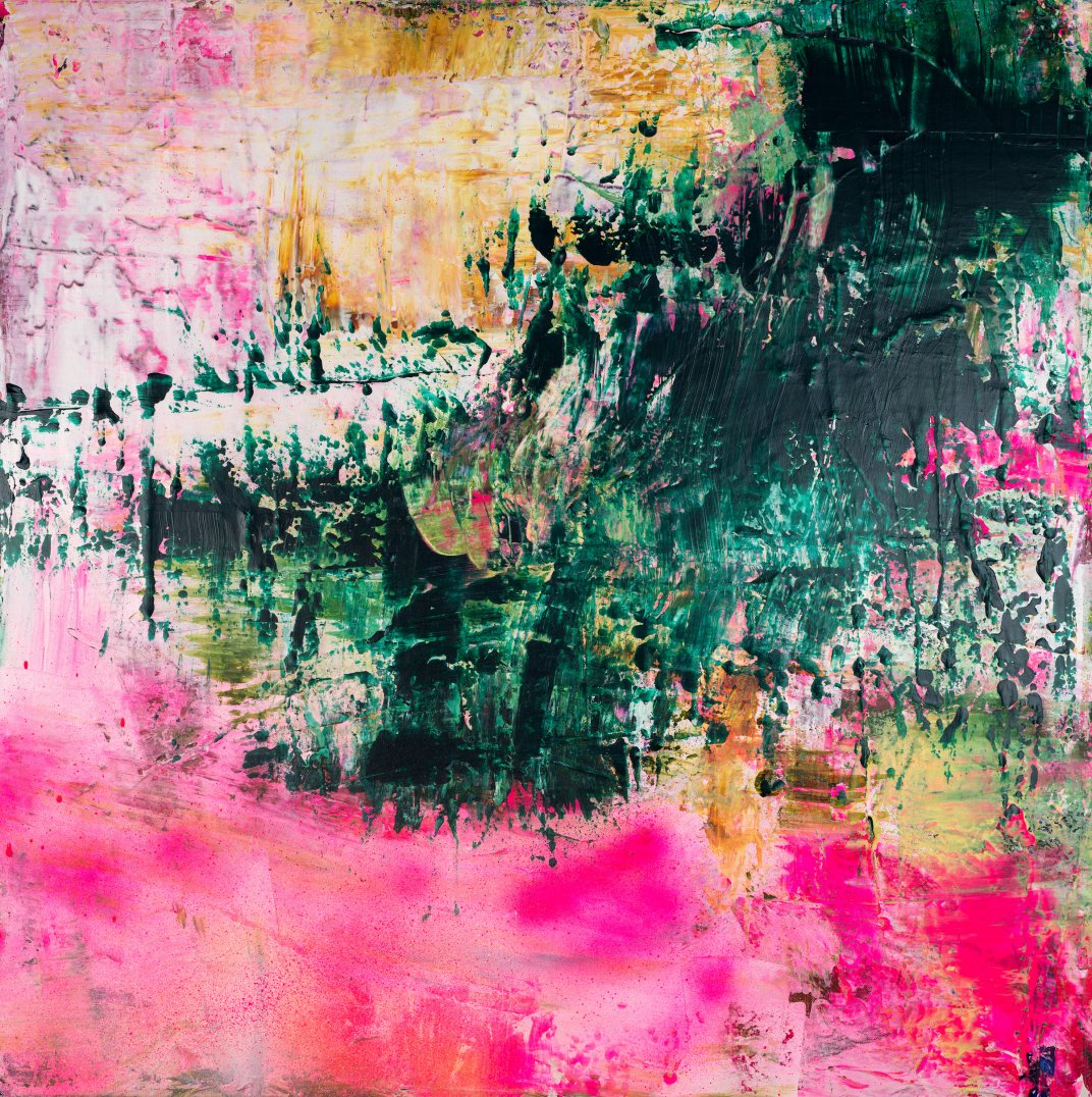 acrylic, spray paint on canvas,