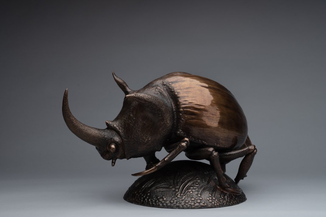 The Sculpture represents a rhinoceros beetle located on a hemisphere on one side and a rhinoceros as such on the other side. The horn of beetle is the horn of the rhinoceros; beetle abdomen is the rhinoceros body.
