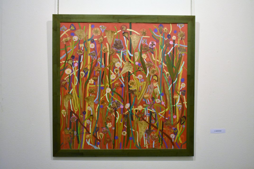 TÉCNICA: Composición creada mediante collage y ensamblage de elementos vegetales orgánicos y telas sobre fondo asemejados a floraciones-ramas-tallos, recreados además con distintos tipos de pintura como óleos y diferentes tipos de pintura como óleos y pinturas de agua (acrílicos, gouaches, témperas, esmaltes ….)