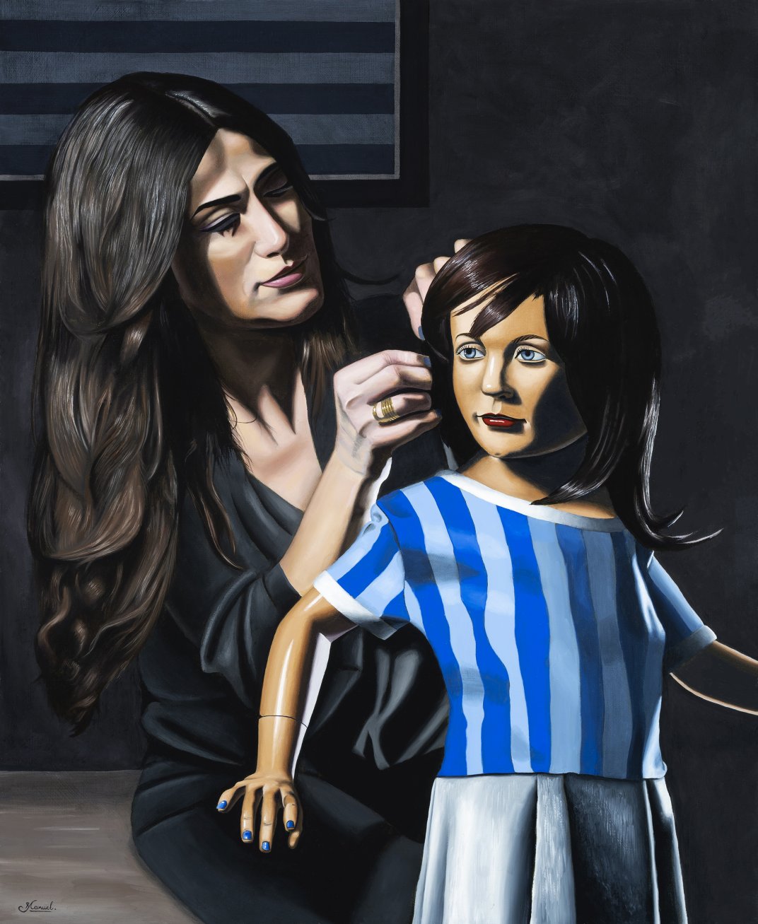 Silent painting. strange atmosphere with a woman and a puppet.