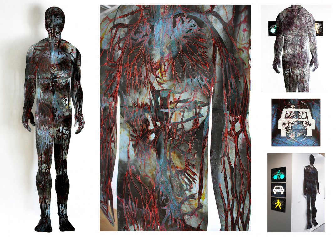 A human body made up of overlays of paint, ink, stitching, road maps and medical imagery cut into an anatomical mix of organs, blood and nervous networks.
