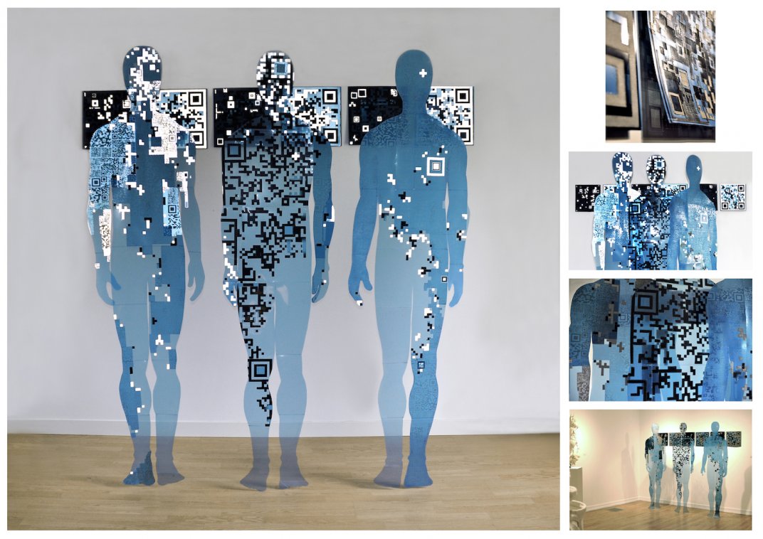 Thanks to a structure, made on an identical basis, and the same black and white graphic, QR Codes are recognizable by everybody and the installation shows three figures standing in front of screens, witnesses of our intrusive contemporary society of conventional signs in perpetual evolution and standing in a quiet exchange.