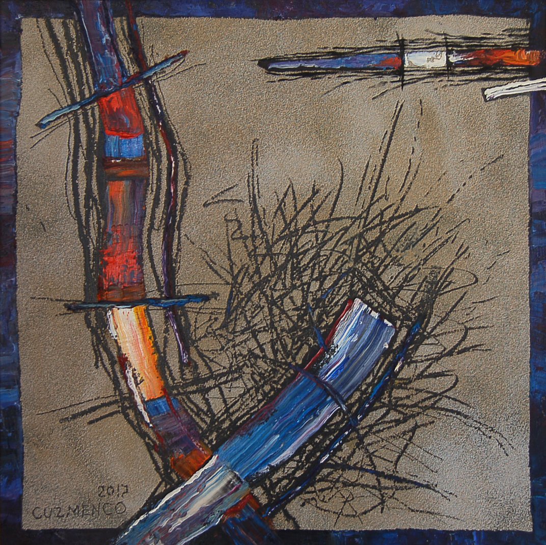 The painting explores the interaction of forms and spaces. The colorful form penetrates into inert space made of sand. It thereby symbolizes the birth of something new. Another form in the upper left corner infers another new space.