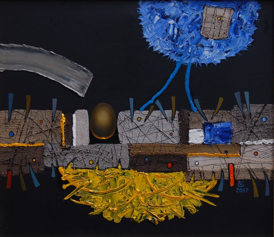The vertical wide fragmented line in the center is made up of various kinds of ground gathered in steppe. It embodies the fragment of this steppe on the black background of cosmos. The wild steppe is trying to break up with its yellow roots and fly into the blue.