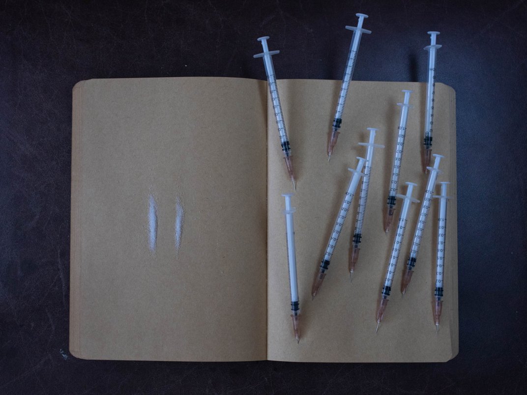 This artwork uses sugar and insulin syringes.