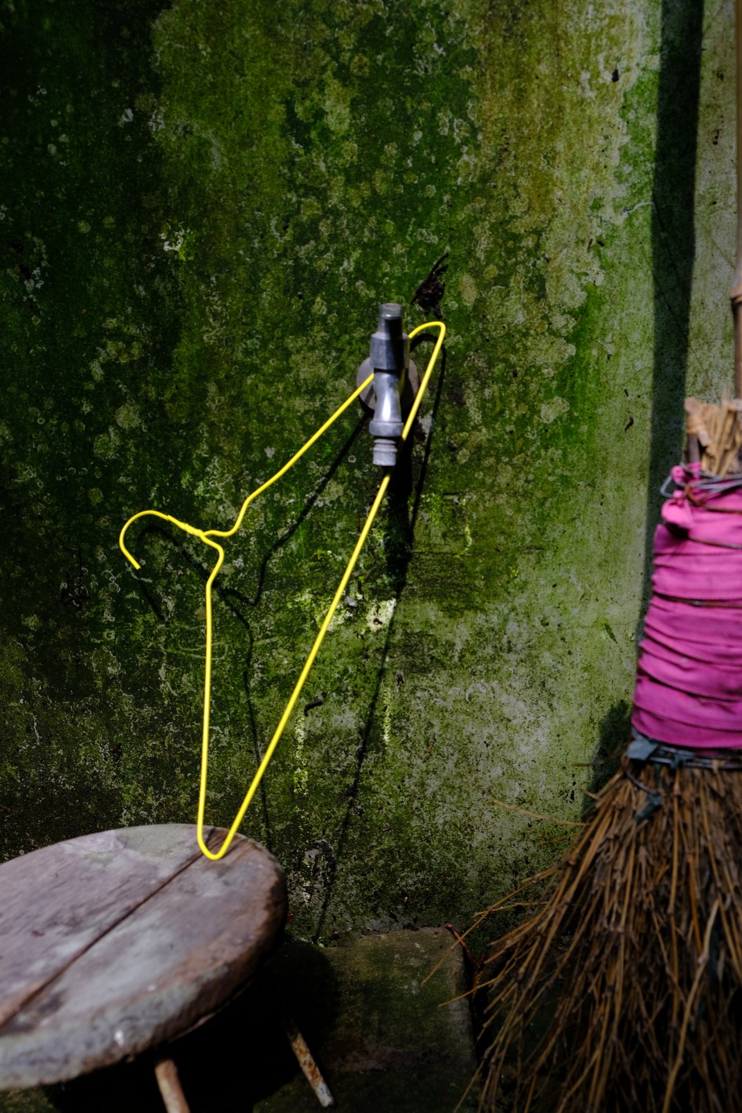 Common, everyday tools of domesticity – the hanger, the faucet, the broom, and the stool – are so mundane and ordinary that we almost forget how beautiful they are as still objects possessing the most intriguing colors. The rustic concrete wall covered in green moss serves as the perfect backdrop for the thin, yellow contours of the hanger and the hot pink rag adds a surprising glamour on the otherwise dull broom. These useful tools are made wonderfully beautiful by their useless colors, calling into question the significance of colors in our everyday encounters.