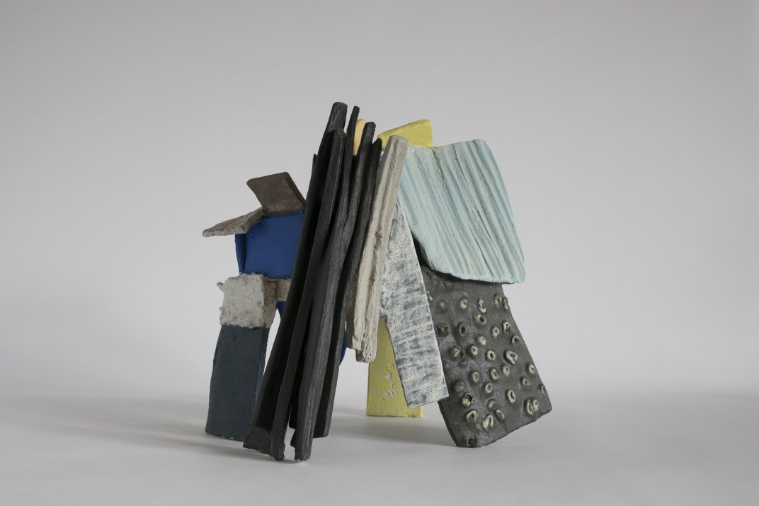 la scultura è il risultato dell’assemblaggio di parti sviluppate separatamente, o meglio di frammenti elementari nati autonomi e poi aggregati quando l'argilla cruda è ancora in grado di legarsi insieme, come se una forza di attrazione improvvisa li avesse calamitati verso un nucleo unitario provocando un esito unitario. Una aggregazione narrativa di frammenti inizialmente a base modulare rettangolare o quadrata, da cui prendono forma delle “capanne” composite di lembi di materia coloratissima che paiono tenuti insieme più da una forza di attrazione che da una coesione strutturale. Dell’architettura hanno conservato l’idea di una forma che si può vedere da dentro e da fuori, che ha un esterno non come limite di un volume pieno, ma ossatura che delimita uno spazio e consente di apprezzarne lo sviluppo interno tramite varchi aperti in più punti, come a voler spingere lo sguardo ad addentrarsi nel cavo perimetrato dalla scultura. L’insieme che ne deriva è dunque molteplice e pronto a rivelarsi sotto aspetti di volta in volta differenti a seconda del punto di osservazione. Non esiste, in fondo, un’angolazione privilegiata per un colpo d’occhio unitario, suggerisco piuttosto di seguire l’avvitamento dei singoli lembi di materia intorno a un asse.
