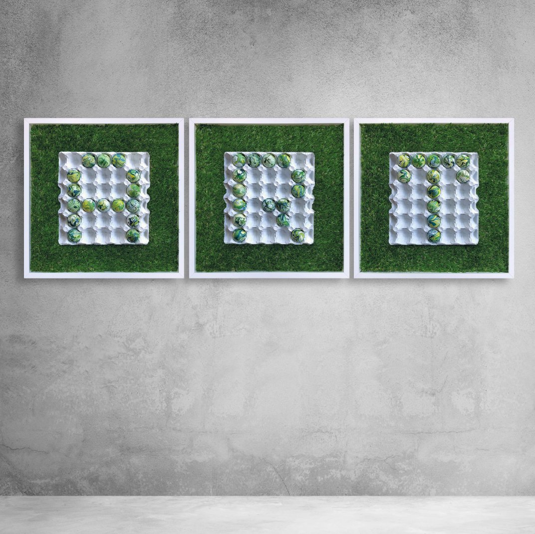 Le palline da golf usate, dopo aver svolto la loro funzione primaria si trasformano da oggetto in soggetto emancipandosi così dalla loro destinazione d’uso. Poste nei cartoni per uova, dipinti di bianco a simboleggiare la rinascita, sono manipolate dal loro ruolo originario e attraverso il colore degli smalti e il formarsi in sequenza della parola ART, generano un’ambiguità semiotica dell’immagine del gioco che con il riuso si fa arte. Gli oggetti degradati o abbandonati ma riutilizzati con un nuovo volto, come in questo nuovo green ricavato da scarti di prato sintetico, potranno così rivivere a sostegno e difesa dell’ambiente anche attraverso inediti linguaggi artistici.