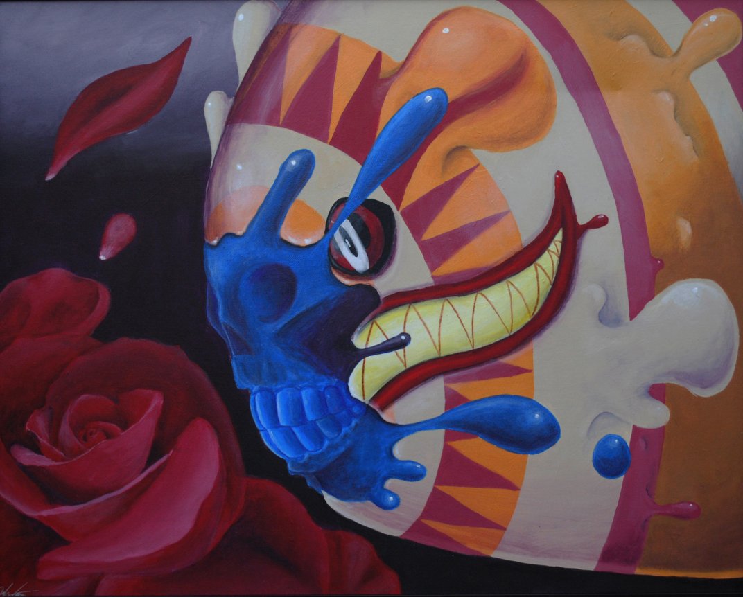 A blob shedding its layers in the presence of a rose, revealing its skull.