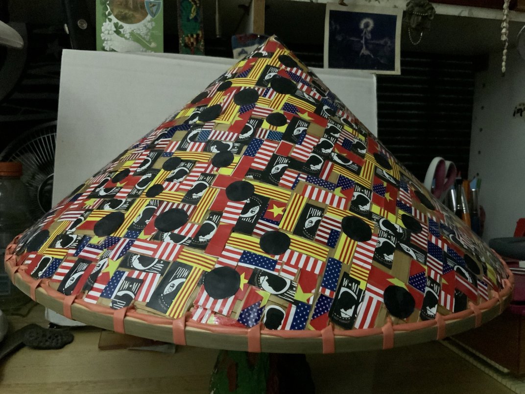 Acrylic, colored pencil, marker, paper, polyester, vinyl on traditional Vietnam bamboo non la (hat).