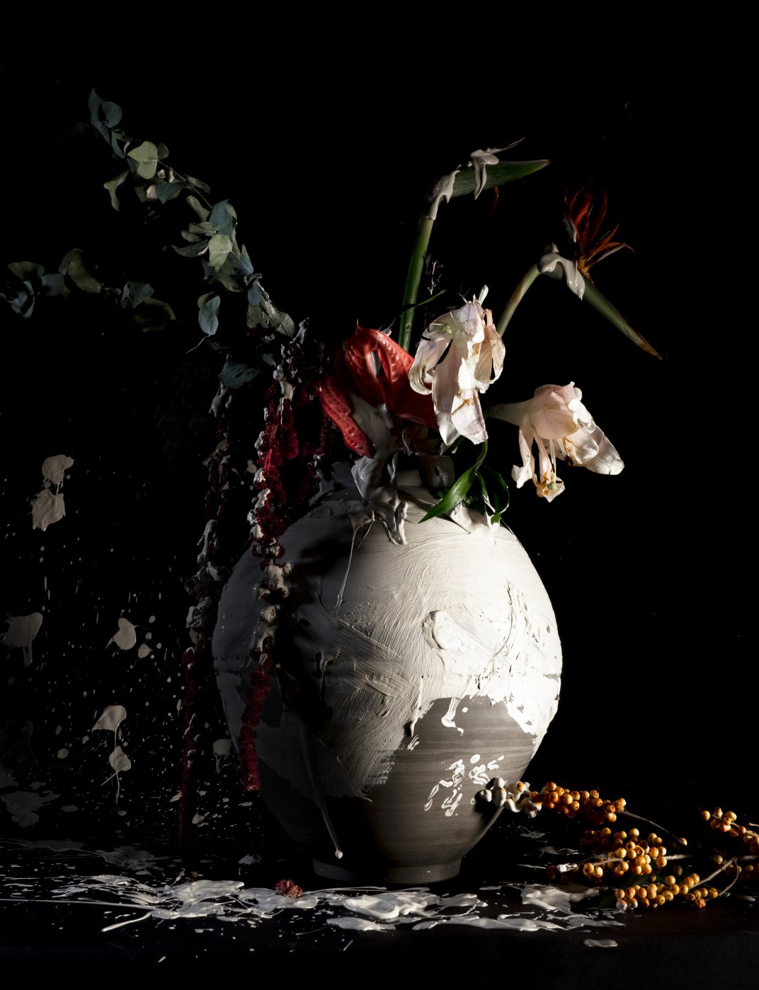 The fresh moment of clay vessel is containing fleeting flowers falling off. It will be fired to be firm and permanent ceramics. The ceramic vessel is void permanently as if opening its mouth to fill the desire. It resembles the ephemeral creatures waiting for death as lost its flexibility.