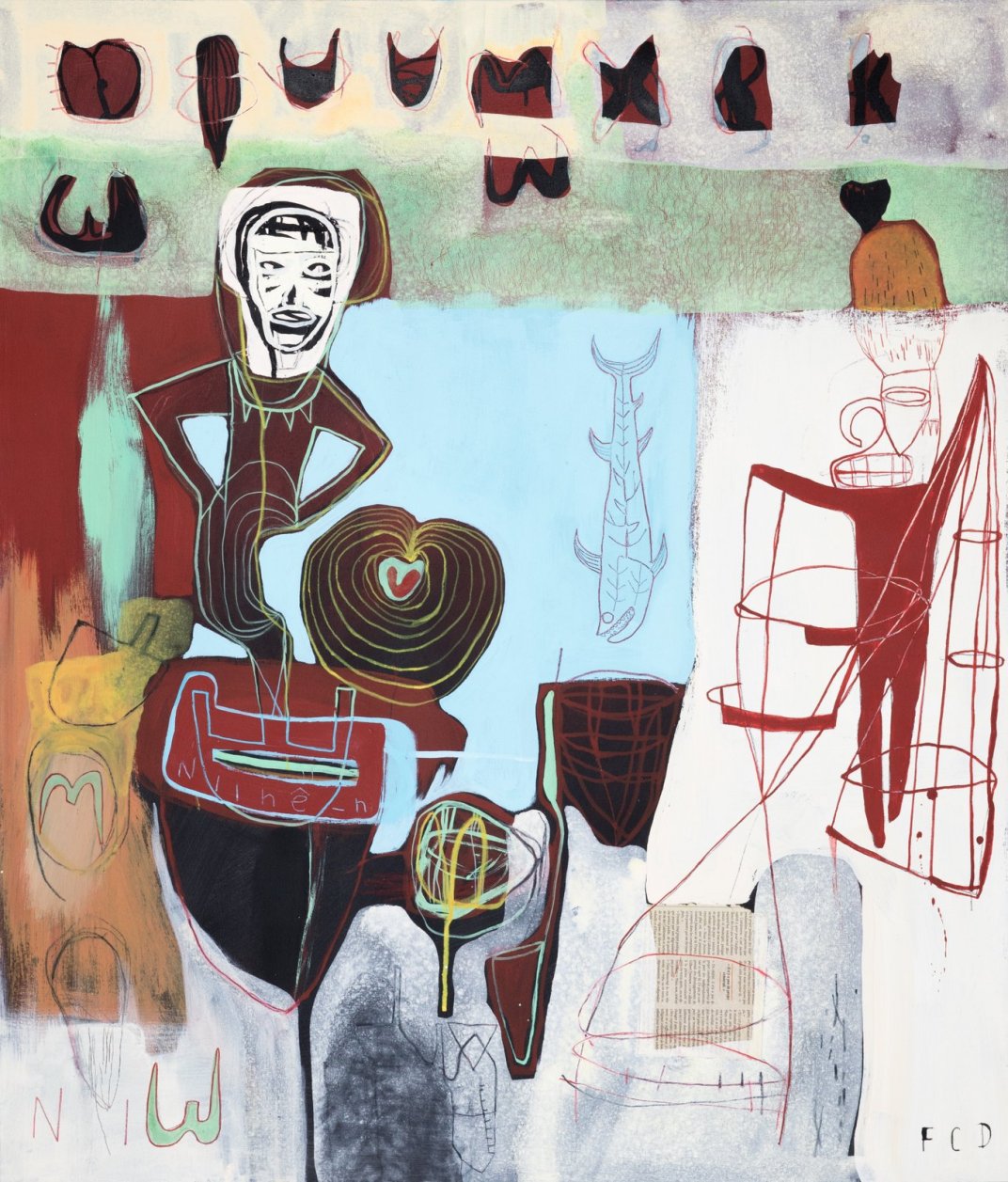 This acrylic work ( size: 102,5 X 87 cm ) talk about a spirit that would have given the nickel to men to fix the iron in their body, but they would have used it for more venal reasons, nickel is the greatest economic resource of my country New Caledonia.