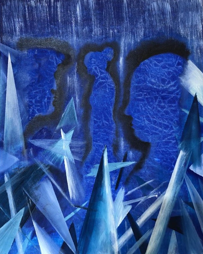 This figurative abstract work deals with the feeling of invisiblity regardless of gender. The use of grattage, shadows and masking tape to create a shattered look and add depth.