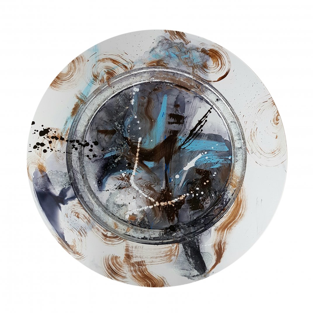 2020 year. The work uses wood, ink, resin, glass chips. Size: diameter 100 cm, depth 4 cm.