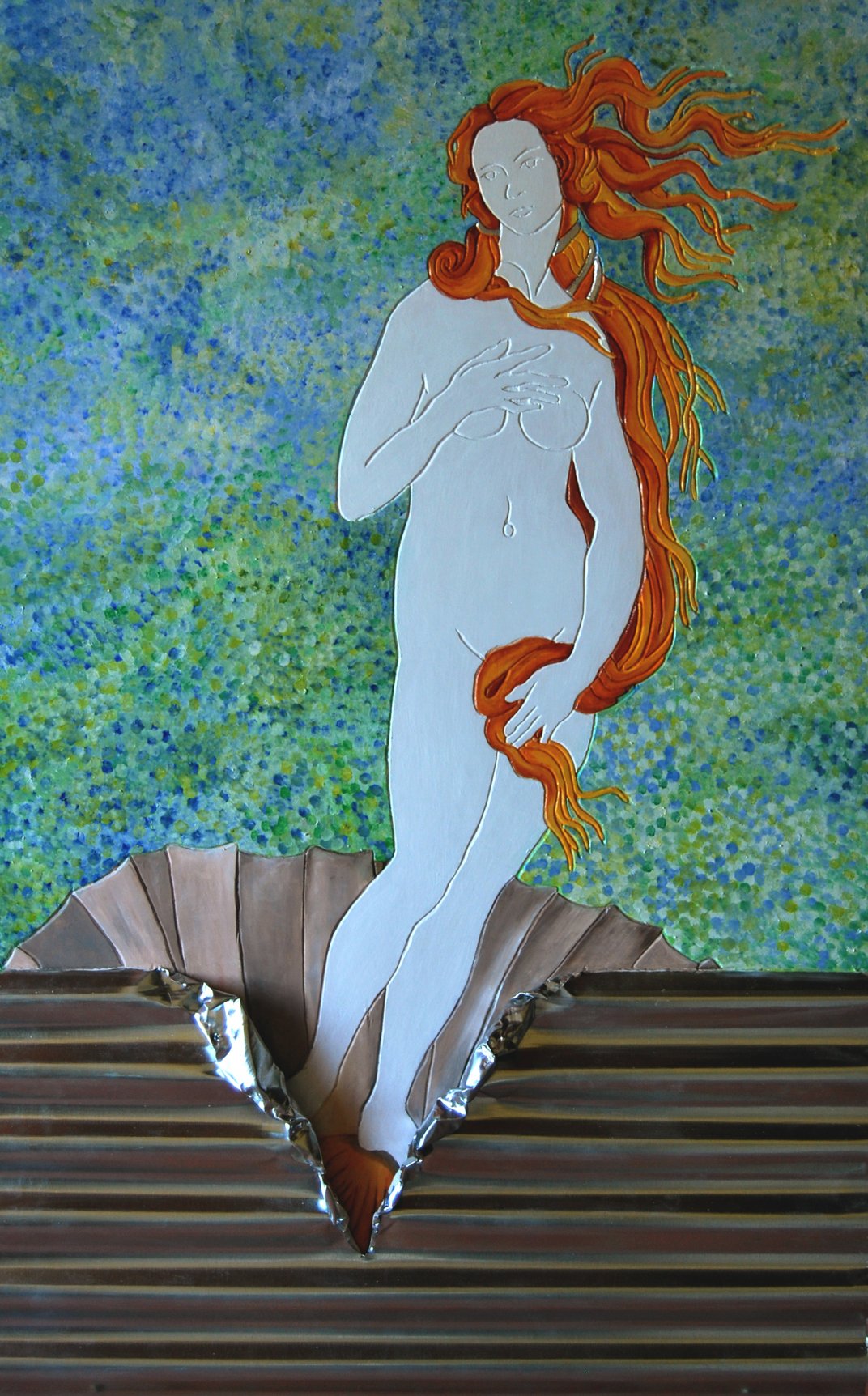Il lavoro vuol essere una rivisitazione dell’opera del Botticelli, con il contrasto rappresentato dall’inserimento della lamiera ondulata in luogo del mare.
