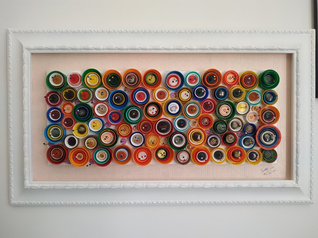 QUESTA E' UN OPERA REALIZZATA DURANTE LA MIA PERMANENZA NEL MIO LABORATORIO ARTISTICO SENZA USCIRE E UNITI AI TEMPI DI COVID-19” ASPETTANDO LA PRIMAVERA MA ANCHE PER RINASCERE ASSIEME A QUESTA PRIMAVERA, COSÌ DIVERSA DALLE SOLITE. HO UTILIZZATO LA PLASTICA COME MATERIALE DI RICICLO O DI RECUPERO PER ABBATTERE LA BARRIERA DELL'INQUINAMENTO NEL MONDO E VALORIZZARE OGGETTI ABBANDONATI COME TAPPI, BOTTONI E SPILLI CHE RAPPRESENTANO VASIO O FIORIERE, TERRENO O PRATO E FIORI IN PARTICOLARE TULIPANI CHE FIORISCONO IN PRIMAVERA. LA MIA VERA ISPIRAZIONE E NON FERMARSI MAI NELLA VITA NONOSTANTE I TEMPI DI COVID 19 MANTENENDO LE NORME DELLA QUARANTENA ASPETTANDO LA PRIMAVERA IN CASA.