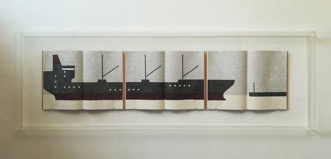 E’ il nuovo capitolo, appena inaugurato. Sagome di grandi navi, come incombenti architetture immobili - è minacciosa e potente - mi ha detto una persona a me carissima, alla quale l’ho mostrata. Ho iniziato con un bastimento commerciale, ne ho in mente altre, penso alle grandi petroliere, ho messo giù il bozzetto di un sottomarino nucleare, e non vedo l’ora di dedicarmici, ed il problema è il pensiero, che va più veloce di quanto possa la mano concretizzare.