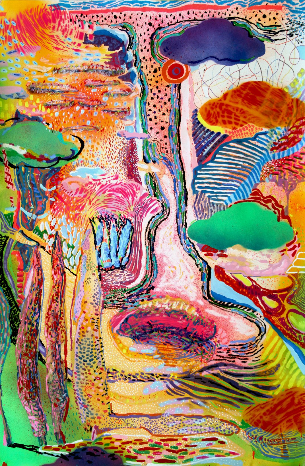 I started this series of 100 drawings and paintings during the Covid 19 locked-down as a means to extend my limited surroundings. While some of the works were informed by “traveling” through Google maps to places I have planned on visiting this summer, others where either visual responses to my immediate surroundings, or were based on an overlap of imagery: some borrowed from reality, other which was constructed. This survivalist exercise reminded me of growing up in Romania, a then Communist country where one had to reconfigure mentally reality in order to endure it.
