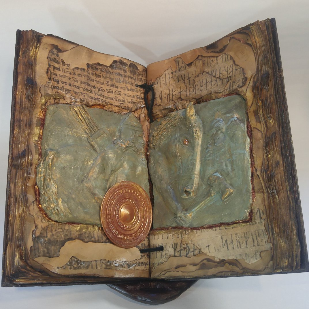 The sculpture is in bedded in a book that was treated with stains and burnt edges to give that old antique look and then bound together with black leather ties.