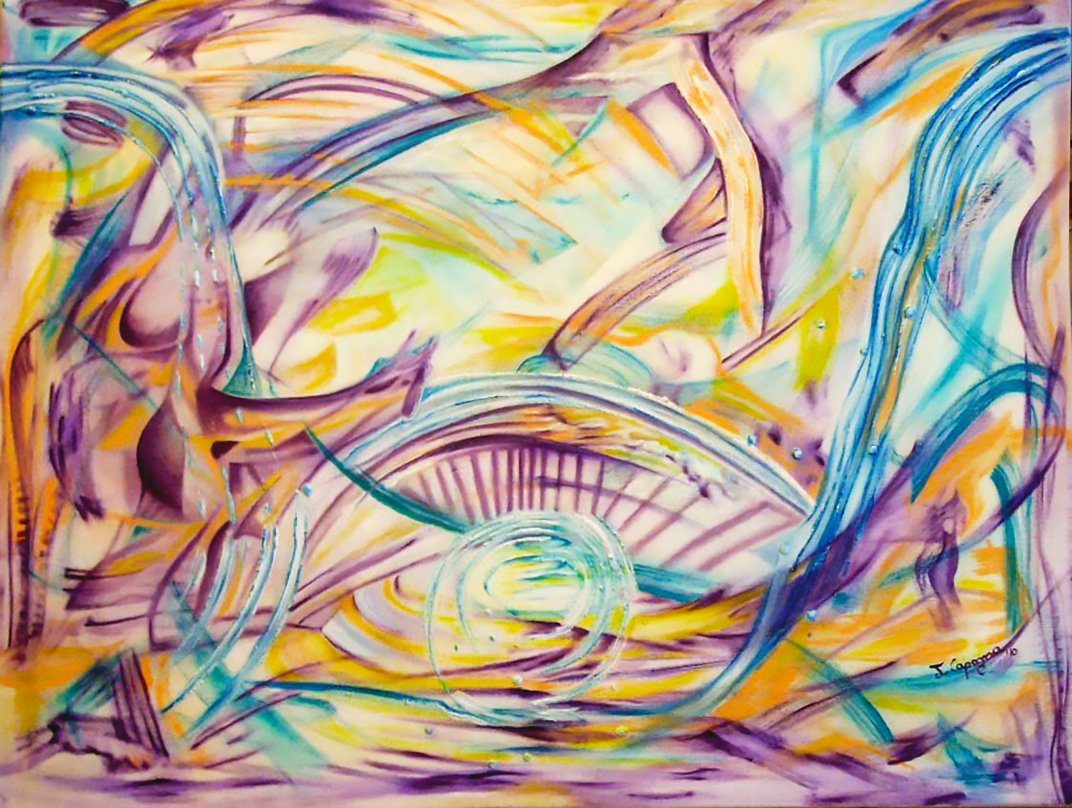 Ogni forma, il ponte in primo piano e le figure sulla destra, si svincolano dalla realtà oggettiva, per essere lette in modo libero e soggettivo. Il mio intento è di far immergere il fruitore, con la sua unicità, nel riconoscere le proprie forme, la propria realtà e il proprio stato d'animo.